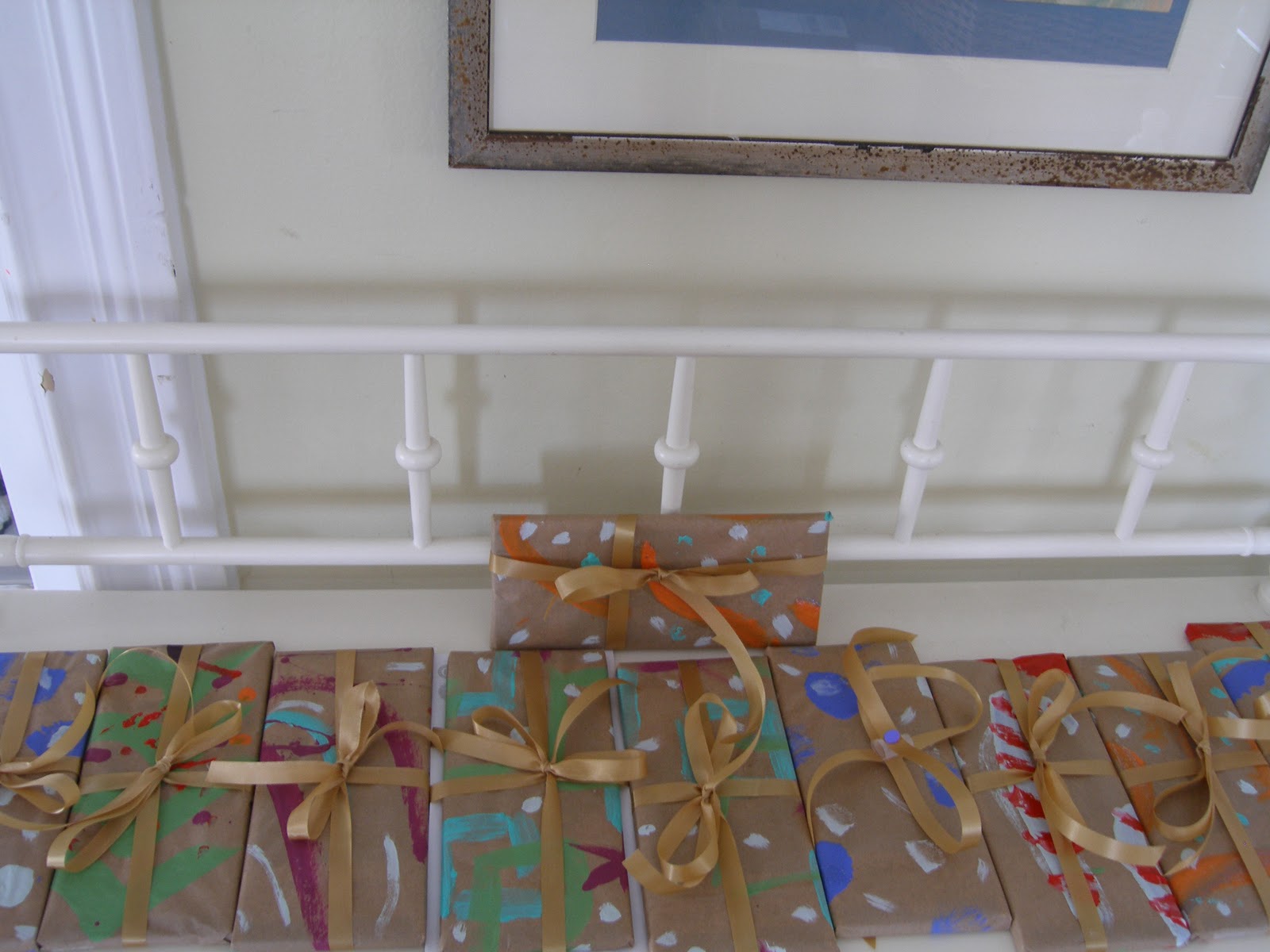 Sheets of brown kraft paper, jars of tempera and acrylic paint and brushes were left on the kitchen table and the kids painted dashes and dabs to the papers as they passed through the kitchen. (Always good to get them picking up a brush since it seems they do less and less as they leave elementary school.)